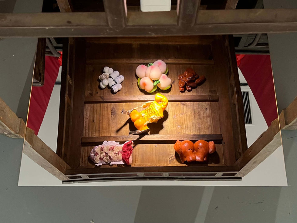 "The Groom is an incisive dissection of contemporary male celibacy and sexual repression. The work reframes the traditional Chinese wedding ritual of ""bai tang"" (bài táng, ceremonial bowing to ancestors) as a distorted, absurd ceremony.